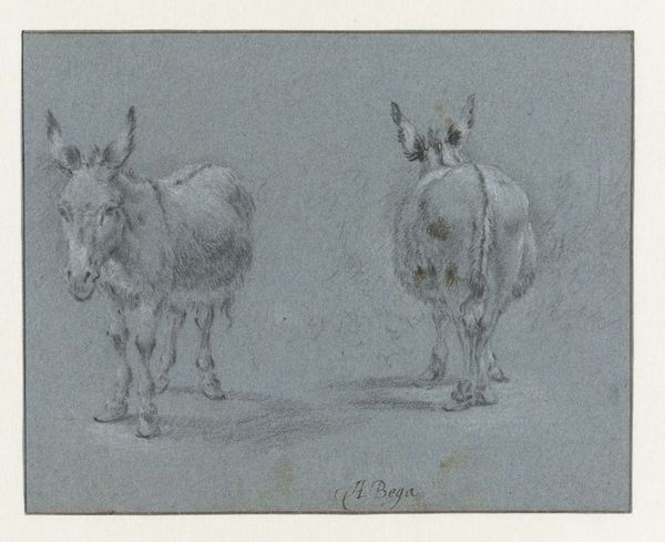 Editor: Here we have "Stehende und liegende Ziege"—"Standing and lying goat"—a drawing housed at the Städel Museum. From what I can tell, it's rendered in pencil, chalk, and charcoal. Something about its simplicity is really captivating. What stands out to you when you look at this drawing? Curator: Well, first, I'm immediately transported! The artist, Friedrich Wilhelm Hirt, captures these goats with such loving detail, doesn't he? It's more than just observation; it feels like a kinship. Look at the texture he coaxes from the charcoal – that wiry, almost rebellious coat of the standing goat. You can almost smell the pasture, can’t you? I’d bet anything he spent hours just watching them. I wonder, what stories did Hirt see in their eyes? Editor: That’s a gorgeous interpretation. I hadn't considered the time spent observing, but that makes total sense. I guess I was so caught up in the technique; I wasn’t really paying attention to the emotional resonance. The 'kinship,' as you say. Curator: Exactly! Technique serves feeling. Think about it: that laid-back goat in the background, the soft lines there, it gives you that calm, rural vibe, wouldn’t you agree? Now imagine it all angular and bold. Different story entirely. The paper breathes the stillness of a country afternoon. Tell me, does it stir anything in you? A childhood memory, perhaps? Editor: Actually, it does remind me of a farm my grandparents used to take me to! I remember the goats being particularly stubborn. It’s so interesting how the drawing can evoke such specific memories and feelings. It shows a kind of…sensitivity? Curator: Precisely! And that’s where the magic happens. It's not just about goats on paper, is it? It’s about the shared experience, filtered through Hirt’s unique lens and landing softly, right here, in our own hearts. It’s less about what we see, but much more about what we feel. Editor: That’s something I'll try to bring with me whenever I view a new artwork. Curator: Me too! It’s like visiting an old friend, every time.