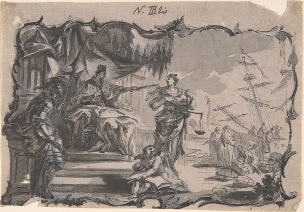 Editor: So, here we have a compelling ink drawing from sometime between 1750 and 1800, "Design for Book Illustration" by Franz Sigrist. I'm struck by its dreamlike quality; figures float against a cityscape. What's your read on this, what story does it tell you? Curator: Oh, this transports me. Imagine the era when ink held such power! See how Sigrist dances between earthly endeavors and divine inspiration? One figure strains over books, earthbound, while above, angels brandish thunderbolts! It's a visual debate – is knowledge found or bestowed, eh? The cityscape looming behind is a delicious detail. A prize for them both? Or something else entirely? Editor: It's almost a visual argument! That makes sense considering the title suggests this was for a book. But the cityscape – could it symbolize earthly power or the rewards of divine intervention? Curator: Ah, that's the fun, isn't it? History is rarely so clean-cut as that which we want it to be. Sigrist cleverly avoids answering it, allowing us, the viewers, to fill the silences with the colours of our convictions and yearnings, no? Editor: I see, the ink isn't just defining figures but inviting us into a kind of intellectual collaboration. It's pretty interesting when you think of it that way! Curator: Absolutely! A successful drawing isn't just about technical prowess, you know; it is the conversation it sparks, like this one, enriching our view not only of the art but our own interpretations! Editor: Well, I will definitely think of drawings in a new light moving forward, a testament to the history between us and a single design on paper. Curator: Perfectly said. Now, how about we ponder how the printer ultimately translated Sigrist's whispers in ink to the printed page? Intriguing!