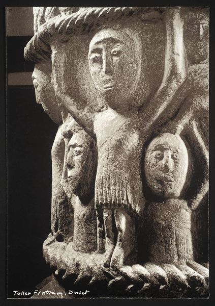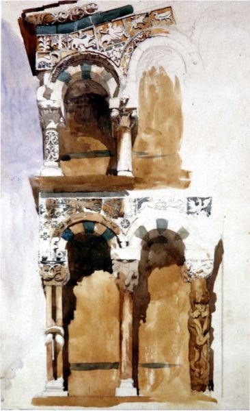 Curator: John Ruskin created this drawing, "Arch from the Façade of the Church of San Michele," in 1849. Editor: It's immediately striking how solid and permanent it appears, even in this monochromatic rendering. There's such strong contrast. Curator: The church itself provides an interesting perspective on 19th-century historicism, drawing heavily from the medieval Romanesque style, with that emphasis on round arches and weighty construction, reflecting broader spiritual and political revivals of the era. How interesting to consider that, even rendered through ink and line work. Editor: Indeed. Look at the layering of the materials that is achieved. The ink simulates stone, mortar, labor - what feelings come through? Is this a reflection on what endures and what is temporal, like us? I wonder, how does his chosen media connect with the themes and techniques in medieval and Romanesque design? Curator: In many ways it mirrors them. The highly stylized, almost symbolic animal and floral depictions resonate deeply with Romanesque sculpture traditions. He understood that architecture wasn't just stone, but it was narrative and a way of relating the population with powerful symbolism. It really echoes an earlier period, where structures were teaching tools. Editor: Right, it all returns to how the labor of creating something mirrors the meaning the something embodies. Consider the actual, physical layering that the structure performs... I am fascinated by the material choices, like that heavy use of line and its function as tone and volume. The physical arch becomes metaphysical. Curator: And Ruskin's style reflects that commitment. He championed a return to Gothic principles of craftsmanship, criticizing the industrial methods of his day. So for Ruskin it seems he also wanted to remind the people in his day how craft brings meaning. He's imbuing it with a powerful cultural and historical perspective. Editor: His labor making the piece invites us to dwell on not only Romanesque materiality, but also its cultural purpose. Thank you. Curator: Thank you. Examining that through our lens has brought forward fascinating layers.