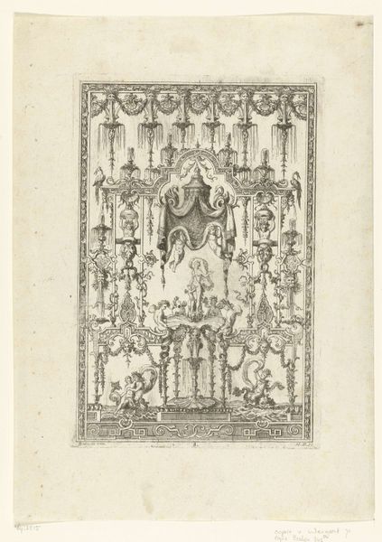 Curator: Oh, this is quite a curious piece! We're looking at "Gedenknaald voor een onbekende schilder," or "Memorial Needle for an Unknown Painter," created as a print by Simon Fokke in 1759. What's your first reaction? Editor: Mmm, melancholic, certainly. There's this almost theatrical staging – a monument framed by lush foliage, with figures draped in sorrow. A rather picturesque lament, wouldn't you agree? Curator: I find it evocative – like a miniature stage set for a tragedy, though the pen and ink soften the blow somehow. The allegorical elements are intriguing, from the grieving muses to the portrait veiled on the monument. All dedicated to a nameless artist! Fokke is creating a kind of double absence here. Editor: Exactly! Consider the needle itself. Its verticality directs the gaze upward, while the drapery conceals and reveals, playing with expectation and loss. This visual rhetoric constructs a powerful, albeit mediated, experience of mourning. And note how line dictates form, yet fades away too! Curator: Right! There’s an anonymity that actually universalizes the feeling. It's less about a specific painter and more about art itself – the ephemeral nature of creation, the potential for work to be lost or forgotten. It feels, ironically, eternal, that a print from the 1700's is still honoring someone forgotten to time. I almost wish I could know this artist now, share a coffee, and tell him they’re remembered. Editor: It’s a fascinating interplay, isn’t it? Fokke uses established Baroque conventions – the allegory, the dramatic composition – but for a purpose that transcends mere stylistic exercise. He engages with art as a concept, with memory, and the very real anxieties surrounding artistic legacy. We're mourning the artist but recognizing them. Curator: A small, intense reminder of what fades and what endures – not just in art, but in life itself. Editor: Indeed. The work really compels us to question the criteria of recognition and reevaluate our aesthetic sensitivity through the act of remembrance. A poignant meditation in monochrome!