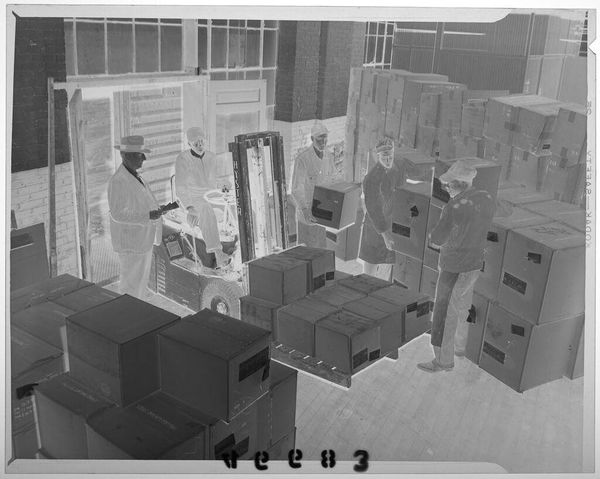 Editor: This is an untitled black and white photograph by Lucian and Mary Brown, showing a woman holding a package on her head amidst other figures in an office-like setting. There's an unusual inversion of light and shadow. What symbols or deeper meanings do you see within this picture? Curator: The woman with the package becomes an archetype of labor and perhaps celebration. The package itself, held aloft, transforms into something almost sacred. Do you notice how the surrounding figures are engaged in work, yet their presence is ethereal, as if witnessing a ritual? Editor: I see what you mean. They seem like spectators to her act. Curator: Exactly! It suggests a communal narrative, a shared experience surrounding this figure and her offering. What emotional response does this evoke in you? Perhaps a sense of everyday heroism or a moment of collective purpose? Editor: I agree, there is something very communal and almost celebratory about this image, despite its everyday setting. Thanks for shedding light on that. Curator: Of course! It's fascinating how an image can distill complex social dynamics into a single, powerful moment.