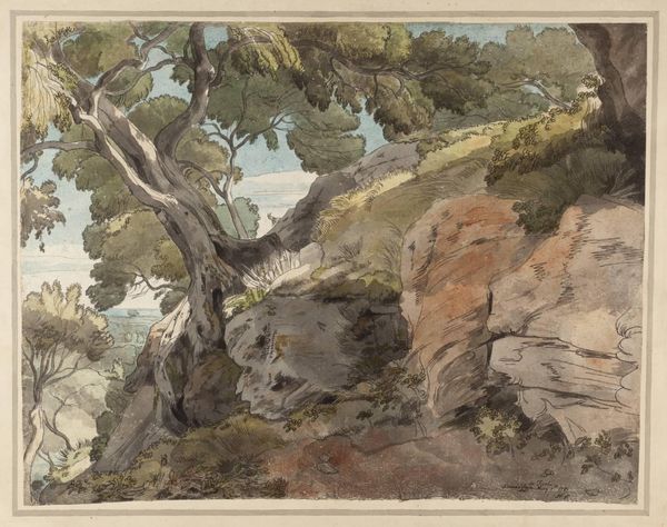 Curator: Standing before us is "Gespleten boomstammen in het park van Metternich bij Marienbad," a drawing completed in 1869 by Johannes Tavenraat. It is a delicate rendering in ink and watercolor on toned paper, now residing at the Rijksmuseum. Editor: There’s a starkness to it, isn’t there? Almost monochromatic, like looking at a charcoal study, even though we know watercolor is involved. These split trunks—they feel like broken sentinels in a silent park. The toned paper adds a layer of aged mystery to the entire scene. Curator: The use of a toned paper base is indeed intriguing. Its inherent hue invites the viewer to fill in the color, engaging memory of natural settings in autumn and winter, seasons symbolic of decline or dormancy. Also notice Tavenraat’s expert use of ink wash to define form and texture—remarkably modern for its time. Editor: Absolutely! He’s captured something so essentially forlorn. These stumps, relics of trees past, become more than just objects; they transform into symbols of loss, of time’s relentless march forward. The light seems to bleed away in the mist around the park and dead wood. There's a feeling that everything is on the verge of dissolving. Curator: Splitting, cutting, hewing trees down has a profound legacy across multiple traditions and regions. This resonates within cultures as distinct as ancient Celtic and far eastern cultures where reverence and careful extraction from old-growth forests dictated traditions and myths. Tavenraat taps into this, I believe, even unconsciously reflecting an era increasingly conscious of its relationship with the natural world. Editor: Which gives the work added resonance today, as our awareness of the scars we leave on the planet has, shall we say, intensified. It reminds us that even in seemingly tranquil landscapes, there's often a story of change, sometimes violent, underlying the surface. This piece whispers volumes, even in its subdued palette. Curator: Indeed. Tavenraat offers a study more significant than simply a visual sketch. Editor: It lingers, this landscape. A poignant observation.