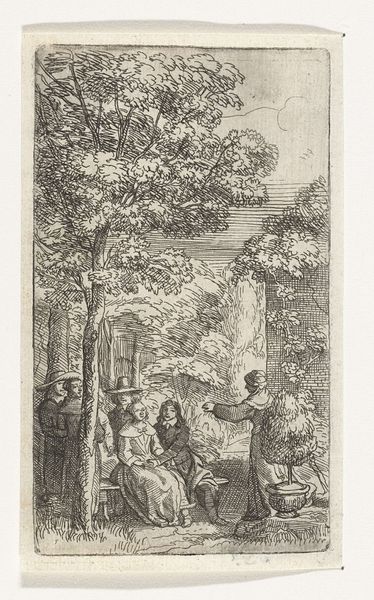 Jacques Dassonville created this etching, “Tafereel met gemaskerde jongen en roede,” sometime in the mid-17th century. The image shows a group of figures gathered outside a humble dwelling. One child is being threatened with a rod by a masked figure. Dassonville was a Flemish artist working in Antwerp, then part of the Spanish Netherlands, a region with a rich tradition of genre painting depicting scenes of everyday life. These images often carried moralizing messages reflecting the social norms of the time. The rod and mask suggest a commentary on the social structure and education of children, common themes in the art of that period. The setting further hints at the rural poverty experienced by much of the population. To fully understand this work, one might research the history of education and social customs in the 17th-century Spanish Netherlands, consulting period documents, literature, and other visual sources to shed light on the cultural context that shaped both the artwork and its audience.