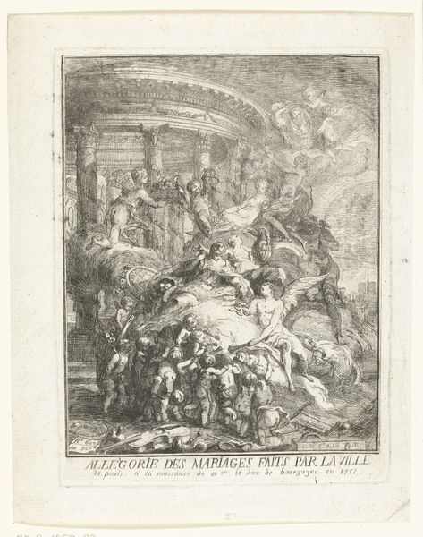 Romeyn de Hooghe created this etching, the title page for Gilbert Burnet's 'History of the Reformation of the Church of England', using a technique that was very much of its time. Etching allowed for detailed lines and tonal variations through the controlled corrosion of a metal plate, typically copper or zinc. The plate would first be coated with a waxy, acid-resistant substance called ground. The artist then scratches through this ground with a needle, exposing the metal beneath. When the plate is immersed in acid, the exposed lines are etched, creating grooves. The depth, and therefore the darkness of the printed line, is controlled by the amount of time the plate is exposed to the acid. Once etched, the plate is inked and wiped clean, leaving ink only in the etched lines. A sheet of paper is then pressed against the plate, transferring the ink and creating the print. This process requires great skill and precision. The final print bears witness to the artist's hand, and also the social and political context in which it was created, with meticulous lines that tell a story of religious and political upheaval.