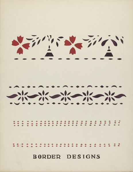 Curator: Here we have "Border Designs from Proposed Portfolio 'Maine Wall Stencils'" created between 1935 and 1942 by Mildred E. Bent. These stencil designs are rendered in a warm, reddish-brown on what looks like aged paper. Editor: There's a comforting simplicity to this; almost humble in its presentation. It speaks to a time when handcrafted details held so much significance within the domestic space. The choice of earth tones creates a sense of warmth and age, like a cherished antique found in an attic. Curator: Precisely. Bent’s designs reflect the continuity of nature motifs used across cultures to beautify the home. The central design evokes a stylized vine, representative of growth, resilience, and the interconnectedness of life. These images are cultural shorthands for very elemental concepts. Editor: And these repeated motifs speak to the politics of aesthetics during the Depression era. Making one’s home beautiful wasn’t simply about personal taste; it was an act of defiance against economic hardship, an affirmation of life during trying times. Decorative art had an important role to play in social identity. Curator: Yes, there is a deep human need to create beauty, especially in moments of upheaval. The regularity and symmetry can be seen as visual symbols of order and stability, something sought during this period. Even in these humble materials, the impulse to leave a mark is unmistakable. Editor: It is fascinating to consider the idea of these stencils existing not just as ornamentation, but also as quiet declarations of agency. Every carefully placed leaf and diamond is a statement about the resilience of the human spirit in the face of economic adversity, a kind of visual self-help. Curator: Absolutely, and those symbols linger long after the hands that create them are gone. Editor: I’ll never look at wall stencils the same way again! Curator: Me neither. These borders hold stories we're only beginning to decipher.