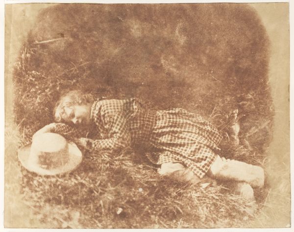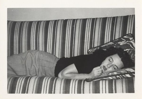 Editor: Here we have Robert Frank's "Longchamp," a gelatin silver print taken in 1949. It shows a woman lying in a grassy field, seemingly asleep, with flowers next to her. I find it striking how intimate and informal it feels for a posed photograph. What catches your eye in this image? Curator: The photograph presents a curious interplay between staged presentation and street photography aesthetics. Consider Longchamp, then a racecourse and park, as a space of societal performance, frequented by different social classes. The image captures an individual’s moment of private repose in a very public place, which is fascinating in and of itself. Editor: I see what you mean. It is in a very open area! Do you think Frank was making a statement about the accessibility of leisure at the time, perhaps its presence or absence? Curator: Precisely. Frank often photographed marginalized communities and unconventional subject matter, capturing their emotional realities. Here, the choice to show the individual not amidst the expected races, but lying down in the park suggests an implicit critique of that highly visible world. Editor: That's interesting, I hadn’t thought of the racecourse aspect of the park itself. It really changes the feel of the piece. It makes the act of rest appear somewhat radical in this public setting. Curator: Yes, and think of photography's growing accessibility during this period, and its power as a medium to democratize image making itself. Now what does this pose suggest about our own potential viewing experiences? Editor: Perhaps a new way to look at these well-heeled individuals beyond the tracks? Thank you, this was a very different and surprising read of the image than I had anticipated. Curator: You're welcome. Analyzing artwork through a social lens definitely makes the work resonate and reveals unexpected meanings.