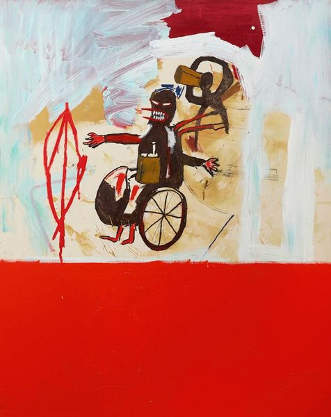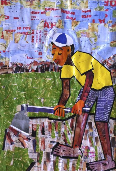 Curator: Welcome. Today, we’re considering Varnette Honeywood’s “West Indian Cyclist,” a mixed-media collage created in 1984. Editor: Immediately, I'm struck by the sense of forward movement, the feeling of an individual pushing boundaries. The cyclist appears calm and resolute amidst what seems to be both an idyllic scene, but also quite abstracted one. Curator: Honeywood often employed collage to build figures and environments. Notice the clean, geometric shapes forming the cyclist and his surroundings, like the rectangles composing his limbs or the thin lines indicating the landscape. The textures also create a unique rhythm for the eyes. Editor: Precisely. The deliberate use of these flat shapes speaks volumes. It reads to me as a conscious flattening of the black figure, nodding to the ways black individuals are often seen—as caricatures—rather than fully fleshed humans with interiority. What do you think? Curator: Interesting perspective, though I initially read the shapes in a less politically charged way. The bright colors – the primary yellows, reds, and greens—feel buoyant. Note, as well, how she employs this relatively limited palette so economically to create distinct textures: the jersey’s flatness set against the landscape. Editor: And yet, consider that within black communities and the diaspora more widely, vibrancy can be a form of resistance, a way to counteract the erasure and marginalization you touched upon. The title directs our understanding – a ‘West Indian Cyclist’ implies diaspora, a disruption from the expected. It seems a powerful celebration and assertion of identity. Curator: I can see that interpretation, yes. I think that both can be right, however. Formally speaking, this work exhibits the simplicity of shape we recognize in children's illustration, yet there is a more mature conceptual rigor underlying it all. The very medium—collage—implies both fragmentation and reunification, reflecting the realities of identity itself. Editor: Yes, the medium definitely lends itself to your reading about reunification, and I certainly believe that there’s also more here beyond a formal analysis as well. Curator: Ultimately, Honeywood creates something striking from basic components, which echoes, in my opinion, our ability as humans to construct something great from minimal means. Editor: And hopefully through more than one lens of history and theory. Let's celebrate more artists who work like this.