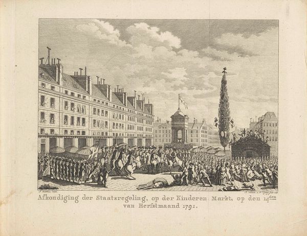 Curator: Here we have a print dating from 1840 to 1841, created to depict "H.H. M.M. arriving at the Palace in Amsterdam, November 27, 1840." Editor: The density of detail in this engraving is striking. The monochrome palette evokes a sense of a bygone era, and the overall atmosphere is...ceremonial, but perhaps a bit stiff? Curator: Well, let's consider the historical context. This print immortalizes a specific moment: the arrival of Their Royal Highnesses—presumably King William II and Queen Anna Paulowna—at the Royal Palace in Amsterdam. The artwork itself becomes a historical document. Editor: Absolutely, it serves as a record. But I'm curious about the public's role here. Observe the diverse crowd – various social classes are intermingling, witnessing a pivotal moment. Yet, who is this really for? Are we seeing a genuine celebration of royalty or a carefully staged demonstration of power? The figures on the left, crowded into balconies or gathered at windows, almost seem to mock the grandeur on display here. Curator: The engraver certainly aimed to capture a sense of national unity and enthusiasm. Royal entries were highly choreographed events, carefully planned to project authority and bolster support for the monarchy, which at this time was dealing with shifts in public sentiments. Editor: It's that staged aspect that intrigues me. The composition almost feels like a theatre set. We have the backdrop of the palace, the actors – the royal couple, the military escorts – and then the audience, the citizens of Amsterdam. There’s definitely a strong propagandistic undertone at play. We’re meant to feel impressed. Curator: Prints like this were a crucial tool for disseminating such images, especially before photography became widespread. This particular piece allows us insight into how the monarchy sought to shape its image and cultivate loyalty amongst its populace during that period. Editor: Right, and it prompts us to question whose narrative is being presented and who is absent or marginalized in this visual representation of Dutch society. It becomes crucial for any museum or historical collection to challenge the accepted story in such pieces. It opens more dialogue. Curator: Precisely. And that kind of scrutiny reveals this image is more than just a record. It’s also evidence of a certain ideological effort. Editor: In a way, the image also memorializes the ambitions of its time. That tension between spectacle and societal reality resonates deeply.