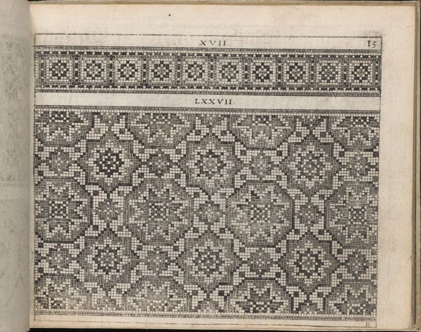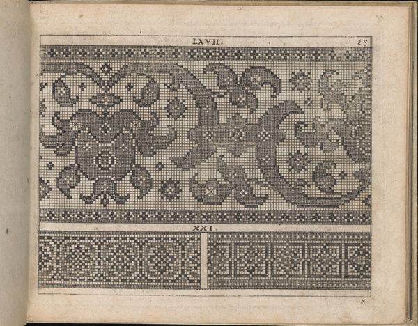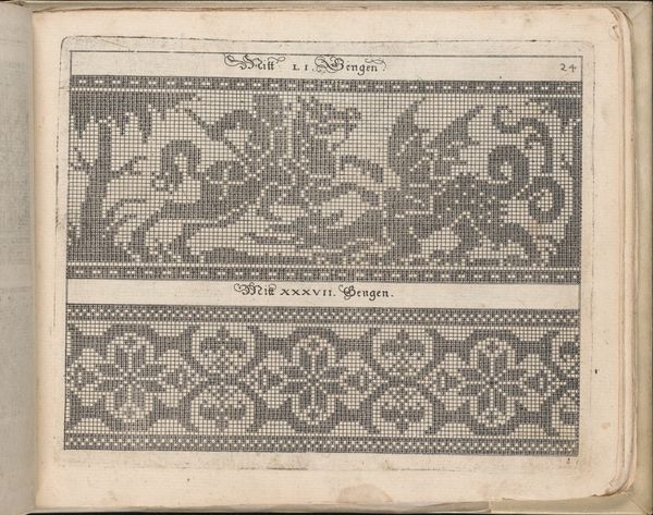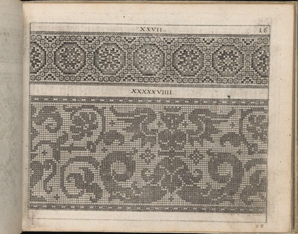 Editor: This is page 28r from "Newes Modelbuch in Kupffer," created in 1604 by Johann Sibmacher. It's a print featuring intricate, almost pixelated designs. There's something both antiquated and strangely contemporary about its geometric patterns and heraldic imagery. What strikes you about this work? Curator: What I find compelling is how this "model book," seemingly a simple collection of patterns, reveals a complex interplay of gender, class, and cultural identity in the early 17th century. These weren't just decorations; they were blueprints for embroidery, a skill deeply tied to feminine virtue and domestic productivity, yet also a potential site for creative expression within those confines. Notice how the geometric designs offer structure and order, yet within that structure, the heraldic symbols and floral motifs hint at personal or familial narratives. What stories were being stitched into these textiles, and by whom? Editor: That’s fascinating! I hadn't considered the act of embroidery itself as a form of storytelling or even resistance. Curator: Exactly! And who had access to these patterns? These books weren’t cheap, so owning one signaled a certain social standing. The act of creating and displaying these embroidered pieces was a performance of identity, reinforcing or perhaps subverting the norms of the time. These motifs are part of visual vocabulary, part of identity construction for women. Do you notice any symbol that stands out? Editor: The heraldic lion definitely catches my eye, juxtaposed with those more domestic floral elements. It's such a striking contrast. Curator: Precisely. It speaks volumes about the ways in which women navigated their roles within a patriarchal society, literally weaving their personal identities into the fabric of their world. The Modelbuch offered tools, didn't constrain talent. Editor: I never thought about patterns carrying so much history. It makes me see these old textiles in a completely different light. Thank you! Curator: Absolutely. Art becomes far richer, once interrogated as part of cultural movements.