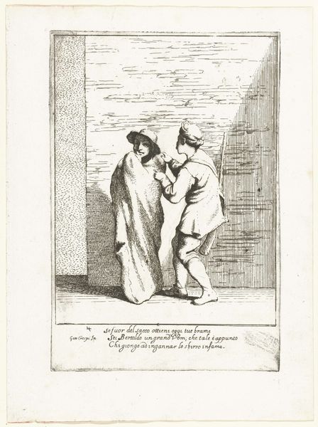 Curator: Let's turn our attention to this engraving, "Portrait of Daniel Van Heil," created in 1649. It resides here at the Minneapolis Institute of Art. What's your initial impression? Editor: They’re caught mid-conversation, aren’t they? A really interesting composition— stark lines, almost a cartoonish quality given their cloaked figures. There's an undeniable element of scrutiny in their sidelong glances. Curator: I'd say this work presents an intriguing case study for analyzing societal perceptions and power dynamics of the time. Note how the stark line work lends itself to creating very individual characteristics in both subjects. This was printed in 1730, a later printing after a work created almost 100 years before by W.M.S chez De Beaulieu and Ostertreich. Editor: It almost feels subversive. Who are these individuals, and what social codes are they either upholding or flouting? Consider their placement on the page— the weight of line creating very firm anchors at the base of each body— their feet and shadows tell us how the piece would be grounded in a specific time and place. Curator: Exactly. In the context of genre paintings popular at the time, such figuration provides insight into everyday lives but through an incredibly subjective lens. This lends weight to questions regarding not only their presence but also representation, making it a social document as much as an artistic piece. Editor: Agreed. Viewing "Portrait of Daniel Van Heil" in our contemporary moment raises crucial considerations of gaze, visibility, and the role visual culture plays in shaping understanding. It’s a reminder of how art intersects with, and can influence, cultural norms. Curator: Yes, and perhaps a challenge for institutions to make available a more open understanding of artistic interpretation within museum collections today.