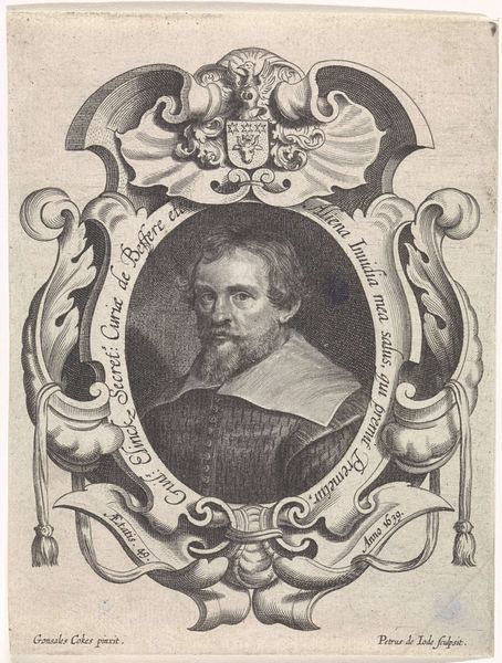 Editor: We’re looking at a finely detailed engraving here, "Portret van Willem Lodewijk, graaf van Nassau-Dillenburg," created around 1640. It seems like a very formal, almost stoic depiction. I'm struck by how meticulously everything is rendered, especially the framing around the portrait. What jumps out at you? Curator: Ah, yes. It's the gravity, isn't it? You can almost hear the pronouncements of state echoing from the print! But I also see a hidden exuberance. Note how the austere portrait busts out into swirling baroque ornamentation—a veritable carnival of allegorical figures, weaponry, and fluttering banners. For me, the question is: does all this visual clamor amplify Willem Lodewijk’s authority, or inadvertently mock it? Editor: Mock it? That's a provocative idea. The text is ornate, classical almost. Is it trying too hard? Curator: Exactly! Think of the era – a time of grand pronouncements, divine right, and, secretly, increasing skepticism. What appears to be unquestioning adoration could subtly undermine the sitter. Or am I projecting? Perhaps, it simply echoes the prevailing tastes…it’s up to the beholder to decide, really. What about the technical skill involved? What impression do you have about it? Editor: I am amazed how someone can obtain such intricate details with this etching. A masterful accomplishment! Curator: And to think about all of these historical nuances embodied in simple strokes of an engraving! Editor: This Baroque flair might hide some political commentary - interesting! Curator: It's all in how you read the signs, isn't it? Each glance offering a different narrative!