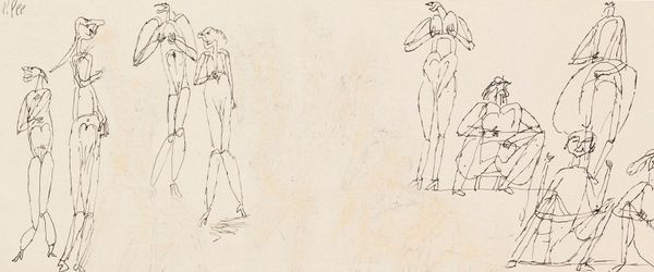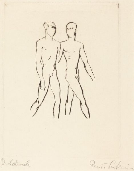 Magnus Enckell made this watercolor sketch, titled 'Boys', with translucent washes that let the paper breathe through the image. It’s the kind of piece where you can really see the process, where the making of the image is as important as the image itself. The figures are loosely defined, almost like ghosts, with the watery paint creating soft, undefined edges. Notice how the colors blend and bleed into each other, like the violet shadows under the figures feet, giving them a dreamy, ethereal quality. The strokes are confident, but not overworked, and that single line connecting the figures hands is particularly telling. It speaks to Enckell's interest in capturing fleeting moments of connection and intimacy. Looking at this, I’m reminded of some of Marsden Hartley’s figure studies, both artists exploring similar themes of male bonding and the expressive potential of watercolor. It’s a beautiful example of how art can be a conversation, echoing and riffing on ideas across time.