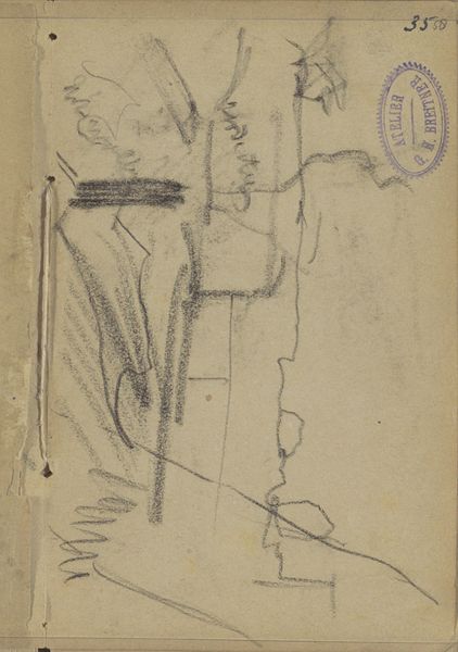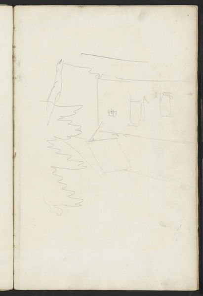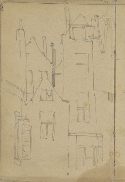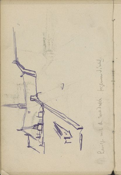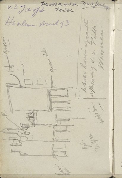 Curator: Here we have George Hendrik Breitner's "Vrouw op straat," likely sketched between 1887 and 1891. It’s a pencil drawing on paper. What strikes you first? Editor: The immediate impression is fleeting – a street scene glimpsed from a window, perhaps? There's a lovely unfinished quality to it. Almost melancholic, would you agree? Curator: The incompleteness is certainly part of its appeal. Breitner, often associated with Amsterdam Impressionism, aimed to capture the immediate reality of city life. This isn't a formal portrait; it's a candid observation. Consider how rapid sketchwork serves the politics of representing urban experience, documenting daily life among ordinary people as it unfolds, unfiltered, capturing both individual figure studies as well as environmental space. Editor: It's interesting that you mention capturing immediate reality. I see layers of history embedded. The medium itself – a humble pencil on aged paper – evokes a specific period. But I wonder about the woman depicted. Do we know anything about who she might be? Are the inscriptions near the street scene referencing other scenes or settings that the artist experienced? Curator: It is indeed interesting that there is handwriting on the work. Details on Breitner's notes found on this sketchbook page unfortunately remain elusive. But, look at the architecture. Breitner uses it almost as a stage set. What narratives do the lines evoke for you? How are certain forms highlighted over others in their level of incompleteness? I would also call attention to his well-documented engagement with photography as an art, not separate from the sketches. Editor: A stage set... yes, exactly! That helps solidify that mood I detected initially. Perhaps the hurried nature heightens the scene's dramatic effect and transient impression, mirroring life as performance and spectacle. But, more than just architectural framing, this technique offers insight to Breitner's interest in the "snapshot aesthetic," informed by and playing off the invention of the portable camera! Curator: Absolutely, and this aligns with broader artistic trends of the era, moving beyond traditional studio practices towards engaging directly with the dynamism of the modern world. We observe so well together when given the time! Editor: Agreed! It's fascinating how this simple sketch opens up so many avenues for understanding not just Breitner's work, but the cultural shifts of his time. Thank you for the context to really "see" what's here, it now speaks even deeper.