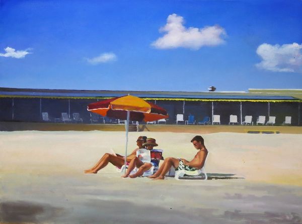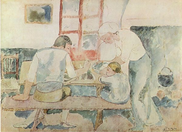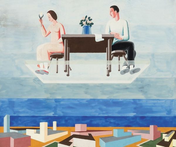Editor: This untitled gouache painting by Ilya Isupov features a peculiar scene: a group of figures seemingly playing with blocks inside what looks like a hollow tooth or maybe a bone. It’s… unsettling and dreamlike. What's your interpretation? Curator: You know, I love that "unsettling" is the first word that sprang to your mind. There’s a definite tension here. A collection of detached bodies enclosed within something that's both protective and constricting. Think of those figures: oblivious in their own world, yet framed, curated almost. What strikes you about their interaction, or lack thereof? Editor: Well, they're all physically present, but absorbed in their own activities. One's on his phone, another is playing with building blocks… there’s almost a sense of isolation, even within the group. Curator: Exactly. Now, consider that donut-headed fellow, reminiscent of Magritte with a side of playful detachment! Isn't it a wonderful contrast—a very adult gathering engaged in childhood games, presided over by that looming…is it an authority figure, that white woman? They seem detached and disconnected, though brought together through space and shared reality.. Or perhaps trapped together? It's as if Isupov invites us to witness some private, odd ritual. He raises interesting questions without giving easy answers, wouldn’t you say? Editor: Absolutely. The setting within that tooth/bone makes the interactions seem almost clinical or observed, instead of lived in and organic. Like specimens under a microscope. Curator: Indeed! And that very sense of clinical detachment allows us to contemplate it all—the playful absurdity, the hidden rules. Isn't art grand that it can make you question, feel uncomfortable, or perhaps, strangely at home, all at once? Editor: This really shifted my perspective! It's not just a weird painting; it's a poignant reflection on connection and isolation in modern life. Thank you. Curator: My pleasure. And you know, sometimes the most unsettling art stays with us the longest!