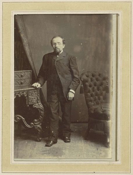 Editor: Here we have a photo, around 1870 to 1910, by Prosper Morren, titled "Portrait of an Unknown Boy Dressed for His First Holy Communion," done using albumen print photography. I am struck by the detail in the clothes – you can almost feel the wool of his suit. What’s most interesting to you about this piece? Curator: The albumen print is itself the key to unlocking much of the social context. The process involved coating paper with egg white, making it light-sensitive. This photograph is an object born from chemistry, from specific industrial and agricultural practices. These albumen prints allowed for mass reproduction, indicative of shifting societal values valuing a new level of widespread distribution of images.. Editor: So, you’re focusing on the industrial processes as crucial to its creation? Curator: Absolutely. This wasn't some unique, handcrafted item for the elite. Photography studios arose that catered to a broader audience. And look at his clothes – the labor that went into producing this child’s formal suit represents a significant investment for the family, illustrating both aspiration and the values of the era. Editor: That makes sense. Thinking about photography as something that could be bought and sold on a wide scale—changing perceptions of image and value in late 19th-century society. Curator: Precisely! We have to consider the availability of materials, the darkroom labor and economic conditions in understanding how art, even photography, functions as both reflection and a shaper of our world. How has our perception shifted now, having dissected the role of the physical making of this piece? Editor: It's fascinating to see the industrial behind even a posed portrait like this. I appreciate now understanding this as more than just capturing a likeness, but an item produced via a material industrial complex. Thanks!