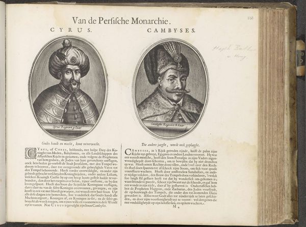 Editor: Here we have "Portretten van de koningen Jotam en Achaz", or "Portraits of Kings Jotham and Ahaz", which is estimated to have been created sometime between 1610 and 1654 by an anonymous artist. It’s an engraving, a print, held at the Rijksmuseum. It's really quite detailed. The faces are so expressive, even though it's just black and white. How do you see this piece? Curator: From a formalist perspective, I'm immediately drawn to the composition. The symmetry is striking, isn’t it? Each king is framed within an oval, mirrored on either side of the page. This creates a sense of balance and order. Editor: Yes, I noticed the ovals too. They look almost like medals. But I'm also curious about the lines themselves, the marks made by the engraver. Are they just representational, or do they have a quality of their own? Curator: Exactly! The lines are not merely descriptive; they *create* form and texture. Notice how the density of the lines around their faces defines the contours, and the varying widths suggest depth. The cross-hatching, especially in the darker areas of the clothing, generates a sense of volume and weight. The lines are active, expressive elements in themselves. Furthermore, we can note how the costumes and headwear create rhythm through shapes that vary in complexity and contrast, no? Editor: So, you’re focusing on the purely visual elements and how they interact? Does that mean that you ignore the subject matter – the fact that they are portraits of kings from the Bible? Curator: Not ignore, precisely, but de-emphasize. For me, the symbolic importance takes a backseat. Editor: Fascinating! I always thought the story *behind* the image was the most important. It's so interesting to think of it in a completely visual way. Curator: Indeed, through visual composition, the lines establish patterns of meaning, irrespective of their connection with Biblical narratives.