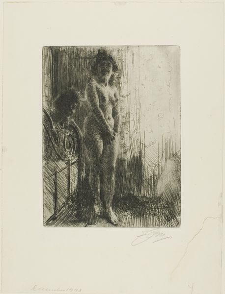Anders Zorn created "Nude Study III" using etching, a printmaking technique, where lines are incised into a metal plate to hold the ink. Notice how the draped fabric behind the figure evokes classical statuary. In ancient times, drapery served not only to conceal but also to reveal, hinting at the form beneath. The act of veiling and unveiling has long held symbolic weight, linked to ideas of mystery, seduction, and the revelation of truth. The image conveys a powerful sense of intimacy and vulnerability, engaging us on a deeply subconscious level. This motif of the partially draped figure continues to appear in many artistic contexts, perpetually evolving. The way fabric is used to obscure and draw attention to the human form taps into our collective memory and engages with the complex interplay between concealment and exposure, influencing our perception and emotional engagement.