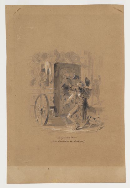 Editor: Here we have Childe Hassam's "Spectators at the Grand Prix" from 1888, likely a watercolor. The scene feels light, capturing a fleeting moment. I'm curious, what do you see in this piece beyond just a crowd watching a race? Curator: From a formal perspective, the brilliance lies in Hassam's compositional choices. Notice how the arrangement isn't chaotic despite depicting a crowd. The carriage provides a strong horizontal base, grounding the visual field, while the figures are layered in a receding plane. This plane creates depth without sacrificing the flatness inherent in the medium of watercolor. Do you notice how the colour palette functions here? Editor: It's mostly muted, creams and browns with pops of red and dark green in the carriage. It gives it a unified but not monotonous feel. Curator: Precisely! The limited palette emphasizes the surface quality. Each stroke and wash of colour isn’t merely representational, but becomes a discrete element. The artist is concerned more about visual organisation rather than representing social or political conditions, say, about being in the crowd. He used this moment for formal exploration, right? Do you agree that it feels less narrative and more like a study of form and colour? Editor: I can see that now. I was initially drawn to the "snapshot" quality, thinking about the people, but focusing on the formal aspects reveals another layer entirely. Curator: This watercolor isn’t merely documenting a spectacle; it is one itself. By analyzing elements in tandem with their presentation within a 2-dimentional frame we come away with richer interpretations. Editor: Right, it’s a dynamic balance, then, between subject and form! Thanks. Curator: Absolutely! And that tension is what keeps art engaging across centuries.