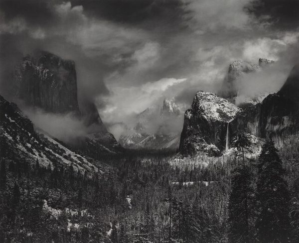 Editor: Here we have Ansel Adams's "Half Dome, Merced River, Winter, Yosemite National Park, California," a gelatin-silver print, created sometime between 1938 and 1980. It’s stunning; the contrast between the dark water and the snow-covered mountain is just incredible. What can you tell me about it? Curator: Well, beyond the inherent beauty, consider the historical context. Adams dedicated much of his career to advocating for wilderness preservation. This image, one of many he made of Yosemite, helped to shape public perception of the American landscape. He worked closely with the Sierra Club, didn't he? Editor: I think so, yes. So the photographs became a form of visual advocacy? How did the institutions of the art world respond? Curator: Exactly. And in terms of institutions, think about how Adams strategically placed these photographs. Exhibitions in museums, government publications, and even commercial ventures – all contributing to a specific narrative: the value of pristine wilderness that needed protection. He really pioneered landscape photography in public life. Editor: It’s fascinating how he used art for a cause, consciously. Were there critiques of this approach? Curator: Absolutely. Some argued his idealized visions ignored the complex social and environmental realities, specifically, displacement of indigenous communities to create the national parks he so admired. Can beauty be a form of blindness, or even erasure? Editor: That's a perspective I hadn't considered fully. The image now feels…layered. Curator: It should. Art is never created or viewed in a vacuum. Thinking about the politics of representation adds depth. Now I’m considering it with new eyes. Editor: Definitely, the layers of intent and reception complicate something that initially seemed purely aesthetic. I’m grateful to look through this different lens today.