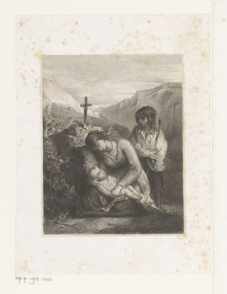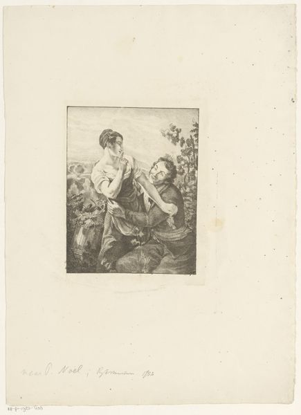 Editor: Here we have an engraving, "Verliefde wijngaardenier" – which I think translates to "Loving winegrower" – made sometime between 1817 and 1867 by an anonymous artist. The figures are very expressive! What can you tell us about this piece? Curator: It's interesting to consider this genre scene within its historical context. How does this depiction of laboring figures potentially reflect or challenge social hierarchies of the time? We see a suggestion of secrecy and perhaps transgression, a common theme during that era. Consider how this artwork might have functioned within the burgeoning print market. Editor: That’s interesting. What kind of market are you thinking about? Curator: Think about the emerging middle class and their growing desire for art that reflected their own lives and values. Prints like these became quite popular. The question is: How might the romantic portrayal of the vineyard contrast with the reality of agricultural labor? Editor: So, you're saying it's not just a sweet depiction of vineyard life but could be reflecting some anxieties around labor? Curator: Precisely. Furthermore, consider where this was displayed - was it a public display, was it intended for a middle-class home? How does the medium influence the narrative and access to that narrative at the time? The availability and politics of imagery are always changing. Editor: That is an entirely different way to appreciate the piece, rather than just the initial 'romantic' impression. Curator: Indeed. Thinking about who sees art, and where, always adds new layers.