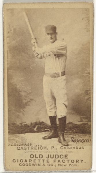 This is a baseball card of Arlie Latham, 3rd Baseman for the St. Louis Browns, created by Goodwin & Company as part of the Old Judge Cigarettes series. The sepia tones and the player's static pose give it a sense of a bygone era. The photograph presents a study in contrasts, between light and shadow. Latham is shown in the act of poised readiness, which intersects with the commercial function of the card as advertisement. The composition is structured by Latham’s figure, which is rendered in soft focus, set against the backdrop of a blurred field, that draws our attention to the product advertised. What this baseball card signifies is not just a portrait of an athlete but also a complex interplay of representation, consumption, and early commercial culture. The use of photography and the act of distribution reflects changing ideas about identity, and the commodification of sports.