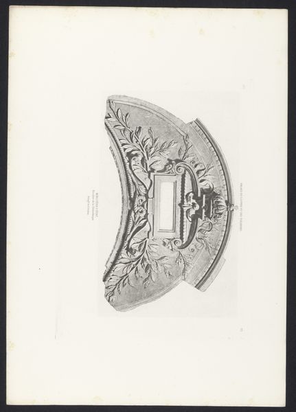 Curator: I'm drawn to the sheer volume of detail crammed into this old photogravure—all these tangled emblems, fighting for space. It almost feels claustrophobic. Editor: That intensity, that tightly packed symbolism, that’s classical architecture for you. This photogravure captures a drawing of a capital—the sculpted top of a column—destined for the Salle du Manège at the Louvre Palace, likely dating from before 1870. Notice how Baldus chose to highlight it; he seems to capture a ghost. Curator: A ghost is right! It’s like someone trying to remember a dream, isn’t it? The Louvre – this seat of power – filtered through layers: architecture, drawing, photo reproduction, then finally arriving here in the 21st century… that’s powerful, you know? All this receding context. Editor: Consider the specific language it’s employing, all these symbolic details speaking directly to ideas about leadership and nation. We see laurel wreaths connoting triumph, intertwined with fasces that signified authority and unity in ancient Rome – and adopted during the French Revolution. See how history literally supports the room in this very direct form. Curator: That's exactly the mood. It feels almost propagandistic, this insistence on visual pronouncements and proclamations... I feel a tiny bit rebellious looking at it now. I’m tempted to deface it with graffiti or add emojis to its surface! Editor: I see it differently. Instead, I see a conversation. What if Baldus captured that historical voice only to reveal it now, in our moment, for it to be reshaped by our own visual languages and ideologies? The neoclassical vocabulary of symbols is quite intentional. It aims to present authority, of course, yet it does so by reaching back into a shared, classical memory. And those memories evolve and change as they travel, generation after generation. Curator: Hmmm, so the symbols carry on, regardless? It's like these historical artifacts whisper into the present, prompting new readings… maybe even provoking a little bit of constructive mischief! I take back defacing it. For now. Editor: Exactly! What you’re sensing, I think, is that very transmission across time.
