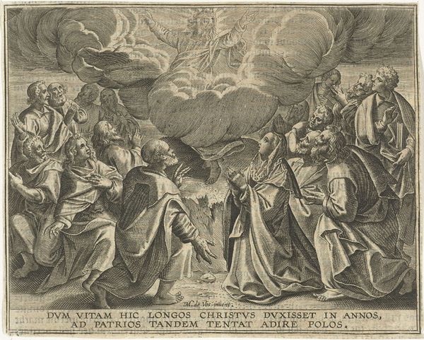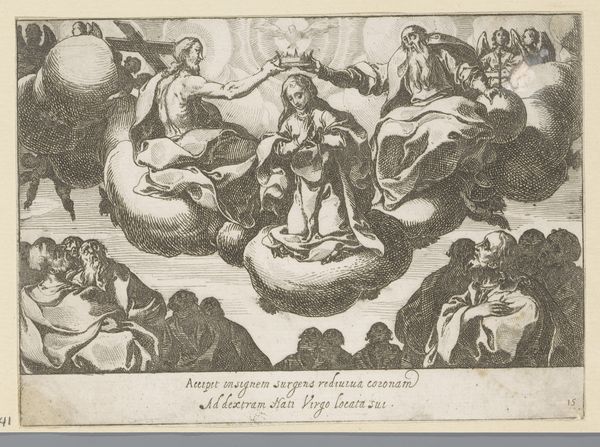 Curator: This print, "The Coronation of the Virgin," was engraved by Jan Collaert II after a design by Maerten de Vos, around 1597. It’s part of the Rijksmuseum's collection. Editor: The engraving style really stands out. The density of the line work creates almost palpable textures, from the wispy clouds to the heavy garments of God the Father and Christ. Curator: Collaert was a master engraver in Antwerp, a city undergoing Counter-Reformation shifts. Viewing it through that lens, the print functions as a clear affirmation of Catholic doctrine, particularly the role of Mary, in response to Protestant challenges. We see her here, being crowned Queen of Heaven, a concept heavily emphasized during that period. Editor: Precisely, but consider also how the composition directs the gaze. The central placement of Mary, her figure illuminated against the darker background, draws us in immediately. The dynamism of the figures contrasts with a symmetrical arrangement. This tension invites us into its sacred moment. Curator: It's fascinating how Collaert visually synthesizes theological concepts—the Holy Trinity represented not just by the Father, Son, and Holy Spirit, but by the coordinated gesture of coronation, emphasizing their unified action in Mary’s exaltation. Moreover, representations of musical angels bolster her position within religious orthodoxy. This imagery underscored the sanctity of traditional beliefs and the powerful role of the Church. Editor: Looking closely, one also notes the variation in the engraving’s hatching. Collaert masterfully manipulates light and shadow to articulate the volumes of the figures. It is not just about the representation of an event; it is also a study in how an event can be illustrated three-dimensionally on a two-dimensional surface through technical ingenuity. Curator: It serves as a window into the socio-political context, doesn’t it? Collaert's technical skill serves not only artistic expression, but the era's deep religious convictions. The engraving visually reinforces existing hierarchies within the Church. Editor: Absolutely, that rigorous, precise application underscores and amplifies what this representation transmits. Thanks to its enduring form, viewers continue to study this print’s enduring historical-religious impact.