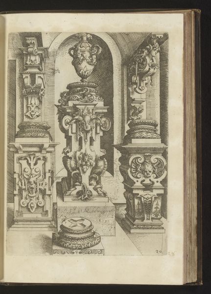 Here we see Wendel Dietterlin’s design for three composite pedestals, rendered in ink around the late 16th century. Note the prominent use of rams' heads, masks, and volutes—these are not mere decoration, but symbols laden with historical weight. Consider the rams' heads. In antiquity, the ram was a symbol of virility, leadership, and sacrifice. They were often linked to deities, embodying strength and fertility. Now, observe how Dietterlin places them within a novel architectural context. These symbols transcend their original religious connotations, becoming ornamental motifs. The persistence of such images reveals a deep cultural memory at play. The emotional power these symbols held in ancient rituals is transmuted into a more secular aesthetic. This interplay between the sacred and the secular demonstrates the enduring influence of the past, shaping the present with echoes of forgotten beliefs. The psychological resonance of these forms lingers, engaging viewers on a subconscious level. The symbols evolve, adapt, and find new life, proving that history is not linear, but cyclical, constantly resurfacing in unexpected forms.