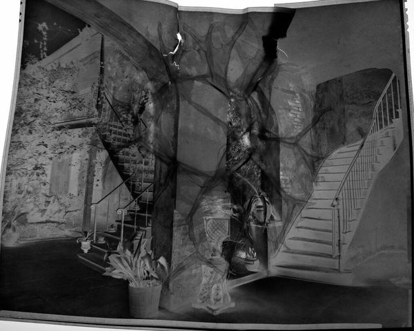 Curator: This is an untitled photograph by C. Bennette Moore, showing the Cabildo courtyard in New Orleans. It measures roughly 13 by 18 centimeters. Editor: The high-contrast negative creates an eerie, almost dreamlike quality. The textures of the foliage and brick are so striking. Curator: Yes, the material presence is quite captivating. Looking at the courtyard, I am drawn to how it signifies a space of leisure and consumption for a specific social class in New Orleans. Editor: I see the composition more as a study in light and shadow. The interplay between the architectural forms and the organic shapes of the plants creates a visually compelling arrangement. Curator: But it also invites us to consider the labor involved in maintaining such a space, the social structures that enabled its existence. Editor: Perhaps. For me, it’s primarily the formal elements – the balance, the contrast – that resonate. It's a beautifully constructed image. Curator: Ultimately, it is a complex work, reflecting both aesthetic choices and historical realities. Editor: Indeed. It invites us to see beyond the surface, regardless of the lens through which we view it.
