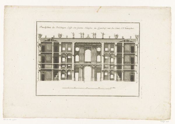 Editor: So, this etching from between 1840 and 1851 by Léon Auguste Asselineau depicts the facade with a Renaissance gallery of the Hôtel de Lunati-Visconti in Nancy. It feels incredibly detailed, almost like an architectural blueprint but presented as a work of art. How do you interpret this work, especially considering its historical context? Curator: Well, this isn't just a rendering of a building; it’s an example of the 19th-century fascination with architectural documentation and preservation. There was growing concern around this time regarding the preservation of historical structures. This etching can be seen as part of a broader movement to record and safeguard architectural heritage, to raise public awareness about their cultural worth. Editor: That's interesting. So, it’s less about the artistic expression and more about documenting history for posterity? Curator: Not exclusively. Academic art, as a style, often served institutional purposes. Etchings like these found their way into publications, serving as visual arguments for historical preservation or informing architectural discourse. How do you think the public might have perceived this image in its time? Editor: Maybe they viewed it as a way to connect with the past? Seeing a Renaissance structure meticulously rendered, perhaps it fostered a sense of national pride or awareness of their cultural lineage? Curator: Precisely. Also, consider the act of reproduction itself. The choice of etching allowed for wider distribution than, say, an original drawing. It democratized access to this architectural imagery, turning the gaze of the public towards urban heritage, contributing to architectural and cultural knowledge. Editor: So the medium itself plays a role in shaping the art’s meaning and reach within society. That makes a lot of sense. Curator: Exactly. Looking at this today, we gain insight into both the Renaissance building and the 19th-century impulse to document and disseminate such images for broader cultural and educational purposes. Editor: I hadn't considered the preservation aspect so explicitly, or the importance of making the art accessible at the time. I’ll definitely look at art with its role in broader historical narratives. Curator: It changes the way you see everything, doesn't it?