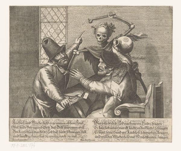 Editor: This is "The Patriotick Barber of New York, or the Captain in Suds," a 1775 engraving by Philip Dawe, currently housed at the Metropolitan Museum of Art. It feels very crowded and frantic to me – a lot going on in one small print. What's your take? Curator: It’s a brilliantly subversive piece, isn’t it? Like a scene ripped straight from the revolutionary fever dream. Notice how Dawe crams the composition, almost mirroring the tensions of pre-revolutionary America. Do you pick up on the satirical edge in how the figures are rendered? Editor: Absolutely! The barber looks genuinely terrified. It’s not a flattering portrayal. And all those wigs in the background, almost like trophies! Curator: Exactly! They become symbols of allegiance and perhaps…artifice. Look at the Captain brandishing that razor; it's like he's threatening not just a shave, but a symbolic scalping, a severing from British loyalty. Dawe's playing with loaded imagery here. It makes you wonder who he sides with, doesn't it? Editor: It really does. The more I look, the more those details jump out. I didn’t notice the wigs on the wall and mannequins at first glance. The artist is almost suggesting how fickle identities and reputations were in such times. Curator: And that is just Dawe using sharp imagery. I enjoy the historical, political, and, dare I say, hysterical commentary. But now tell me, are you on Team Shave, or against? I am on team commentary! Editor: Now that's a loaded question... maybe it depends on what I learn from all those wigs in the end! Thanks for pointing those out. I need to ruminate about it!