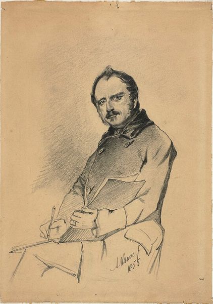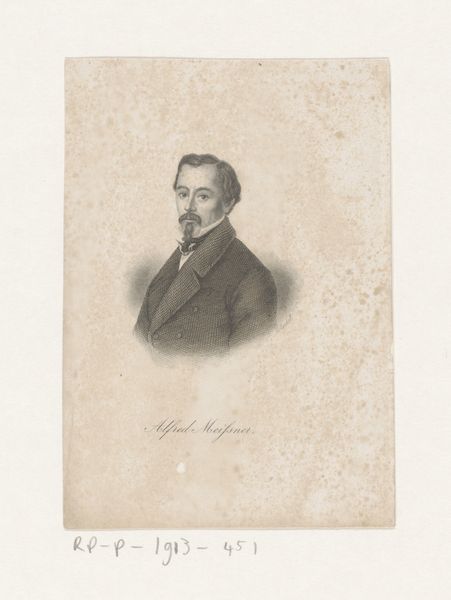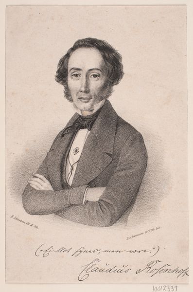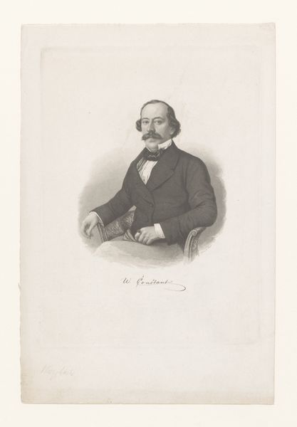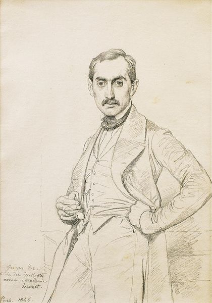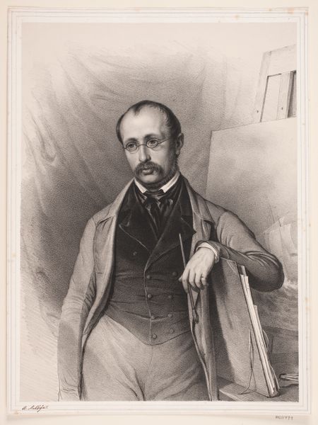 Curator: This is Achille Devéria's "Self-Portrait," a chine collé print housed here at the Harvard Art Museums. There's no specific date assigned, but Devéria lived from 1800 to 1857. Editor: He certainly has a striking gaze. There's a boldness here, a sense of direct confrontation with the viewer that is quite compelling. Curator: It's fascinating to consider Devéria's role in the Parisian art scene. He was well-connected, running a popular salon where artists, writers, and intellectuals gathered. How might his social position shape the reception of this self-image? Editor: Absolutely. In the context of early 19th-century Parisian society, this self-portrait might read as a statement of artistic and perhaps even social authority. The confident pose, the focused stare—it all speaks to a certain level of privilege and power. Curator: I appreciate how you've situated this portrait within its socio-historical context. It deepens our understanding of both the artist and the era. Editor: And for me, looking at this work has revealed layers of meaning that resonate across time, reminding us of the complex interplay between identity, representation, and social power.