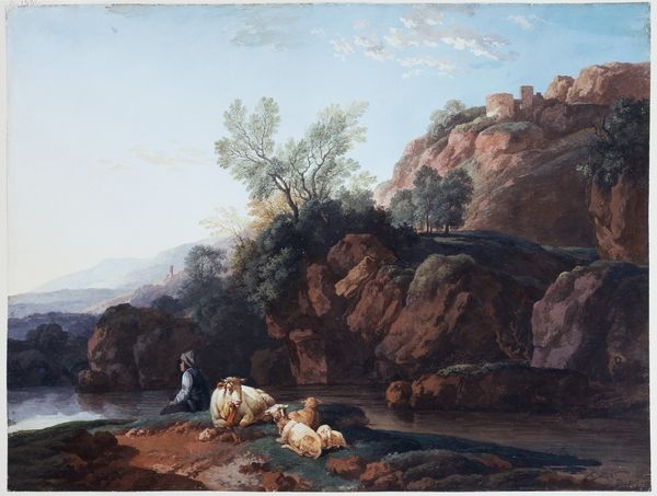 Editor: This watercolor landscape, "Burg auf einem Felsen über einem Flußtal" by Johann Georg Wagner, shows a castle perched high above a river valley. I find it incredibly picturesque, almost like a stage set. What stands out to you about this piece? Curator: What immediately strikes me is the romantic idealization. It’s not just a castle, it’s a carefully constructed image meant to evoke feelings of grandeur and perhaps, nostalgia. How do you think the depiction of nature, with those soft washes and picturesque details, contributes to this ideal? Editor: Well, it definitely creates a serene, almost dreamlike quality. The scale feels manipulated; the castle looms, but the figures in the foreground seem dwarfed by the landscape. Was this a common theme, perhaps commenting on power? Curator: Absolutely. During the Romantic era, we see artists frequently contrasting the insignificance of humanity against the vastness and power of nature. Castles, often ruins by this point, became potent symbols of a bygone era. It begs the question: is Wagner merely depicting a scene, or is he making a statement about the changing social and political landscape? How might contemporary viewers interpret that image of the crumbling castle versus the "ideal" depiction of nature? Editor: So, the idealization isn't just about aesthetics, it’s also tied to historical and social context? That makes me reconsider the calm surface – perhaps it hints at deeper anxieties about the decline of certain power structures. Curator: Precisely. Art rarely exists in a vacuum. By examining the social and political climate of the time, we gain a much richer understanding of an artwork’s purpose and reception. Editor: I learned so much – seeing how historical context changes how we see this piece, its more than just aesthetic beauty, it's got a social dialogue to uncover. Curator: And now hopefully others looking at it can begin that process, too.