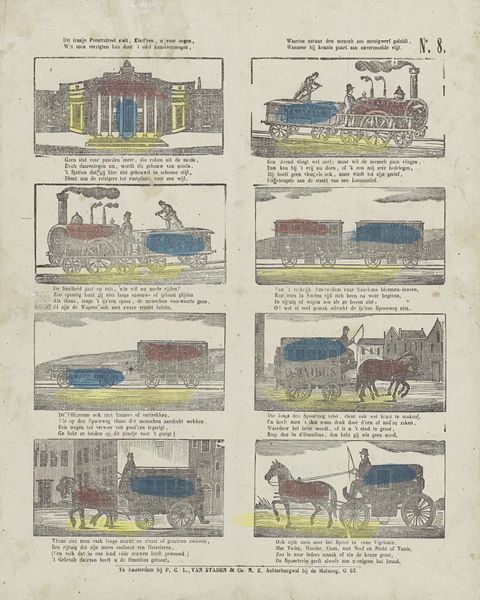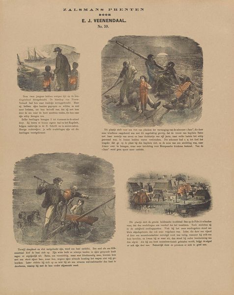 This lithograph, made by Albertus Willem Sijthoff sometime in the 19th century, is a page of children's prints titled "Nieuwe Hollandsche Kinderprenten." These "children's prints" are windows into the values that 19th-century Dutch society wanted to instill in their children. The images offer a glimpse into Dutch life, but also its colonial endeavors. We see scenes of trade, travel, and encounters with nature, all framed within a European perspective. The juxtaposition of domestic tranquility with scenes of labor and travel reflects the complex relationship between home and empire during this era. It prompts us to consider how such imagery contributed to shaping a sense of national identity and cultural superiority in young minds. The prints are not merely innocent amusements but tools for instilling a particular worldview. They remind us of the power of visual culture in shaping perceptions and reinforcing societal norms.