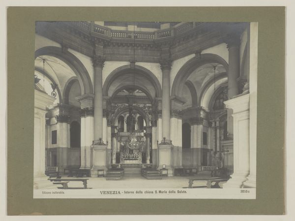 Editor: Here we have a photograph entitled "Interieur van de Oude Onze-Lieve-Vrouw Visitatiekerk te Budel," created around 1902. It looks like a monochrome image of a church interior, evoking a sense of serenity, maybe even solemnity. It seems so still, silent almost. What stands out to you most in this piece? Curator: Stillness indeed. It's captured, isn't it? This frozen moment of reverence, decades ago. For me, it's the light – how it filters, almost reluctantly, through the space. Makes you wonder about what shadows it conceals. Makes me reflect on time. And churches! Always whispers of past lives and faiths humming about, don’t you think? How does the architectural space hit *you*? Do those columns make you feel anything? Editor: The columns give a sense of grand scale, even in the small photographic format. They do seem imposing, suggesting permanence, but they could also appear slightly cold... Perhaps that's just the starkness of the image. Do you see a particular significance in photographing a church interior during this period? Curator: Early photography had this fascinating relationship with truth, didn't it? As if to document existence before it faded. A church, in 1902, was still a locus, a social nucleus, *especially* in smaller towns. But the photograph captures it absent of people… is the photographer reflecting some cultural shift, some anxiety perhaps, or maybe they’re interested in… geometry? That repeating rhythm of the columns! The rise of new possibilities and perspectives that could shift perception. Makes you think, eh? What would be sacred for *you* to photograph in the world, eh? Editor: I never considered it as potentially reflective of anxiety or broader cultural shifts. It's fascinating how much a seemingly simple image can hold. Curator: Exactly! We project, reflect. That's the magic of art, isn't it? This picture has quietly haunted me – a soft ghost story… but perhaps now, it feels… brighter.