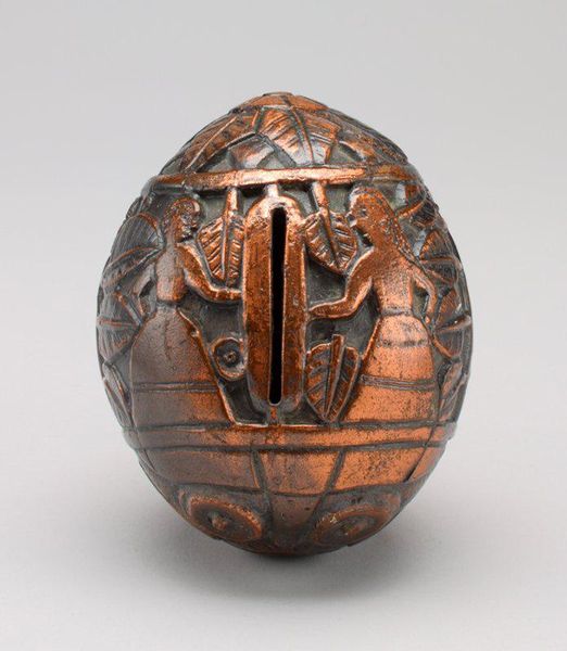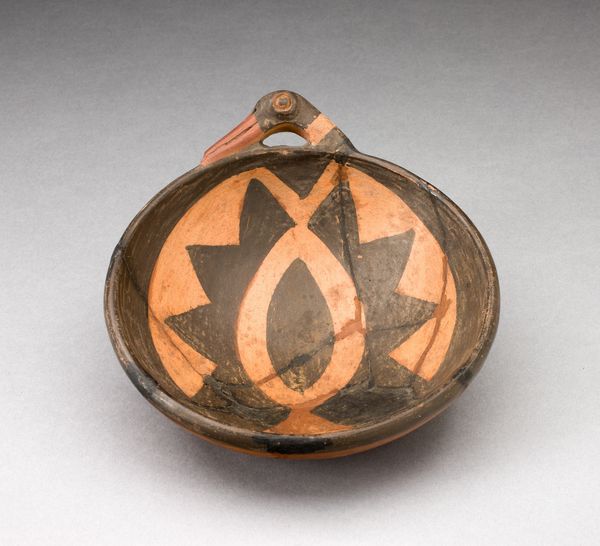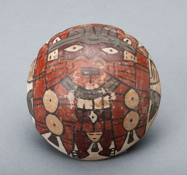Editor: We’re looking at a Nazca flute or small container from around 180 to 500 CE, crafted from ceramic. I'm immediately struck by the contrast between the smooth, almost pebble-like form and the sharp, linear abstract motifs painted on its surface. It's a small object, yet there's something quite powerful in its simplicity. How would you interpret this work? Curator: From a formalist perspective, the interest lies primarily in the arrangement of visual elements and their material instantiation. Note how the painted motifs articulate the vessel's curvature. Are they merely decorative, or do they offer a kind of spatial counterpoint? Consider also the materiality; the ceramic is humble, yet it bears an elaborate design. What structural relationships do you see here? Editor: I notice that the painted elements appear to radiate from the center and edge of the vessel. They are not evenly distributed but seem to cluster, creating a sense of movement. Curator: Precisely. Furthermore, consider the line quality: notice the variation of line thickness in the abstract design. Does this subtle characteristic add depth or disrupt any possible meaning-making? What principles of semiotics might be applicable in approaching these visual devices? Editor: I had not considered the subtleties within what appeared like simple ornamentation. I guess what seems straightforward might demand more intricate viewing habits? Curator: Indeed. By focusing on elements like form, composition, and line quality, a new avenue for analysis can become visible. What started as a simple container gains newfound dynamism and sophistication. Editor: Absolutely. I'm left wondering about the function of these patterns, how they might engage us as we attempt to unlock their underlying framework. Curator: That’s a keen observation and perfectly elucidates our exchange here: an attention to structure illuminates novel perspectives of even the simplest form.