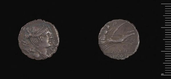 Curator: This is a Roman silver denarius, minted by L. Calpurnius Piso Frugi. Its worn surface hints at centuries of circulation. Editor: The cool, muted tones evoke a distant, patriarchal past where images like this reinforced Roman power structures. Curator: Note the idealized portrait; the sharp relief and clean lines are typical of Roman portraiture. It speaks to an aesthetic of strength and order. Editor: But what does that aesthetic serve? This coin also reminds us of the economic systems built on inequality that fueled Roman expansion and subjugation. Curator: Indeed, but consider the craftsmanship: the die engraving, the coin's weight...these elements create a cohesive visual language. Editor: A language of empire, privilege, and control. I find myself more conscious of who is excluded from this narrative than included. Curator: A vital perspective. Ultimately, this object is a testament to art's power to embody complex histories. Editor: And our responsibility to engage with that complexity critically.