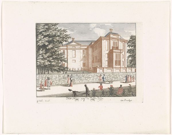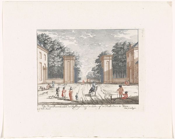 Editor: So, this is an etching from 1695 called "Gezicht op de stallen aan de noordzijde van de voorpoort bij Paleis Soestdijk," which translates to "View of the stables on the north side of the front gate at Soestdijk Palace." It's by an anonymous artist and is currently held at the Rijksmuseum. What strikes me is the sort of idealized view of everyday life it captures, and I wonder, what do you see in this piece? Curator: It whispers stories to me of a world both familiar and dreamlike, much like catching a snippet of an old fairytale while strolling through a garden. Notice how the formal architecture almost melts into the unruly embrace of nature, as if the palace grounds are a stage for a gentle, whimsical drama. The figures feel so deliberately placed. Almost choreographed. Are they really engaging, or just existing in this captured slice of life? Editor: I never considered it as theatre before! It’s interesting how the lines of the building guide the eye deeper into the scene, towards the gate. I didn't even consciously notice that at first. Curator: Exactly! That gateway offers a glimpse, an implied narrative of further journeys, both literal and imaginative. This etching doesn't scream at you; it invites you to linger and create your own whispers. Editor: It's amazing how an image can hold so much more than just a visual representation, like echoes of stories and dreams caught in paper and ink. Curator: Indeed. It serves as a quiet reminder that art can transport us. It takes root in our imaginations, blossom there, and bear fruit far beyond its humble origins. And isn't that just...lovely?