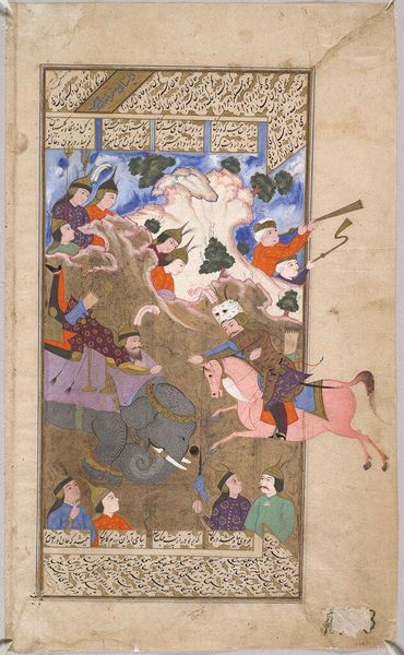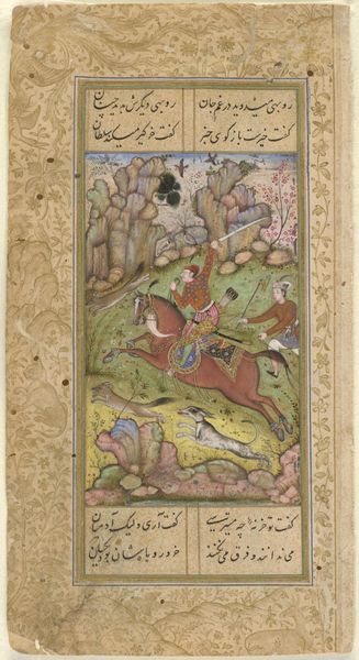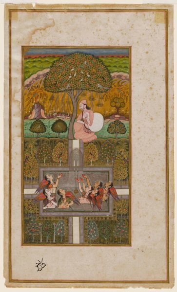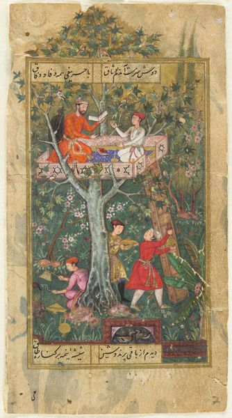 Curator: This folio, attributed to Shaykh Zada and dating back to 1540-50, is titled "Dara and the Herdsman" and comes from a manuscript of the Bustan by Sa’di. Editor: It feels like a garden of dreams, doesn't it? The way the figures are scattered, almost floating amidst the dense foliage. It's enchanting. Curator: The organization of space here is complex; Shaykh Zada is really pushing the boundaries of perspective. The flat planes and intricate details create an all-over pattern. Editor: I love the way all the animals are painted with such care. It's as if each one holds a secret, each with a story to tell. Curator: Absolutely. This really exemplifies the Safavid aesthetic with its refined line work, vibrant colors, and sense of courtly refinement. Editor: Yes, it reminds me that art can be a portal, a secret garden where our imagination can roam free. Curator: Indeed. I find myself drawn to the tree in the center of the piece and its abundant, surreal fruit. It is a scene where even the natural world reflects a deeper, symbolic order.