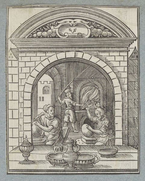 This print, "Two silver trumpets are used to summon the community," was made by Christoffel van Sichem the Younger in the 17th century. It is a woodcut, a relief printing process where the artist carves an image into a block of wood, leaving the design raised. Ink is then applied to the raised surface and transferred to paper. The stark contrast of the ink on paper creates a graphic quality, emphasizing the lines and shapes of the composition. The act of carving demands simplification, resulting in bold outlines that communicate form and texture efficiently. Note the detailed rendering of clothing, architectural elements, and the instruments. As a means of mass production, woodcuts like this played a crucial role in disseminating information and imagery. This one depicts an everyday scene within a community, highlighting the relationship between art, labor, and the broader social context. It reminds us that even seemingly simple images can carry significant cultural weight.