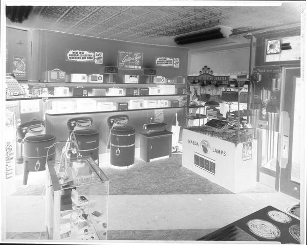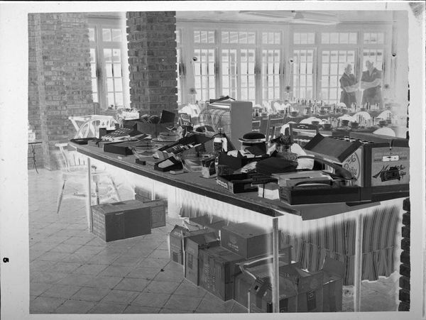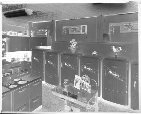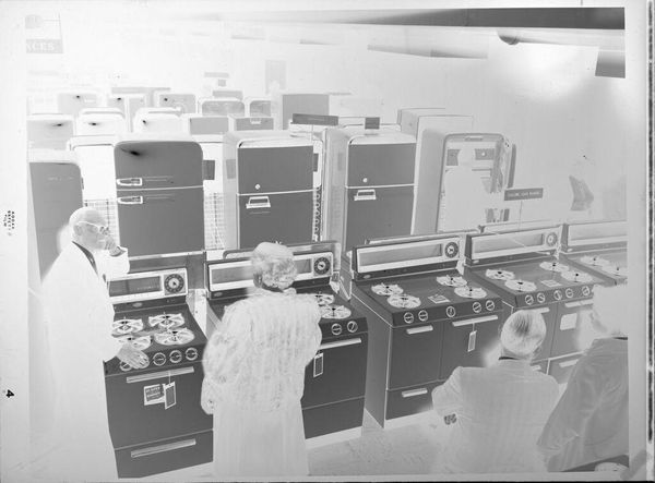 Editor: This intriguing photograph, "Untitled (appliance showroom)" by Peter James Studio, presents a striking array of kitchen appliances. The inverted tones lend a somewhat surreal quality. What formal elements stand out to you in this piece? Curator: The stark contrast between light and dark immediately captures attention. The artist has clearly emphasized the geometric forms inherent in the appliances themselves, creating a play of rectangles and circles. Note, also, the strategic use of repetition, furthering a sense of constructed order. Editor: So, the composition itself becomes the subject? Curator: Precisely. The photograph transcends a mere depiction of appliances; it engages with the viewer through its formal arrangement and stark tonality, prompting a consideration of shape and pattern. Editor: I see it now; it’s not about the appliances themselves, but about how they’re arranged. Thank you! Curator: Indeed. The artist uses everyday objects to invite a deeper look at abstract forms.