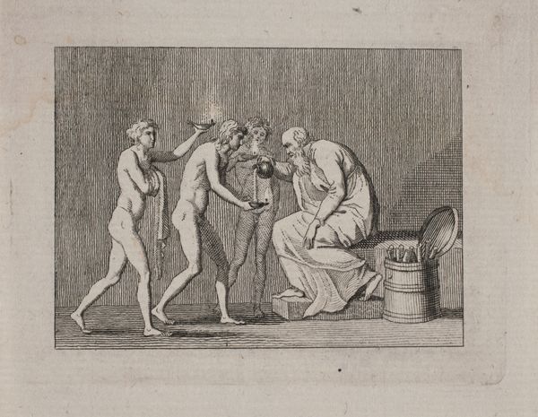 This engraving, "Plate 7: Psyche attended in her bath by nymphs," was made by Agostino Veneziano around the early 16th century. The composition is structured by a clear foreground and background, inviting us into a classical scene of bathers and attendants. Veneziano uses line and form to guide our eyes through the space. Notice how the figures are meticulously outlined, their postures arranged to create a flowing rhythm across the plane. The use of perspective, though somewhat flattened, suggests depth. This flattening effect almost seems to challenge traditional notions of spatial representation. Within the context of Renaissance art, this engraving functions as a semiotic system. Each element—the figures, the bath, the architectural details—conveys layers of meaning related to classical mythology, beauty, and the human form. Yet, Veneziano subtly destabilizes these classical ideals through his manipulation of space. The artwork invites a deeper engagement with its underlying structure.