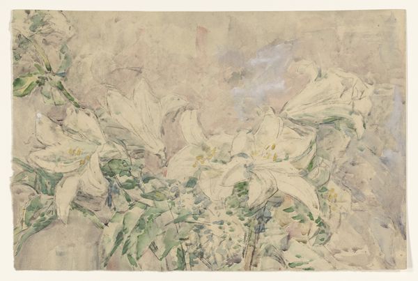 Curator: Right, let’s talk about "Chrysanten en enkele andere herfstbloemen" (Chrysanthemums and some other autumn flowers), a work by Theo van Hoytema. We believe it was created sometime between 1873 and 1917. It’s a watercolour. Editor: You know, my first impression is almost of a half-remembered dream, the way the flowers seem to fade in and out of focus. It feels ethereal, fragile somehow, almost like you could breathe on it and it would dissipate. Curator: I can see that. Chrysanthemums, particularly in East Asian art, carry heavy symbolism, representing longevity, joy, and even nobility. They arrived in Europe much later, and I always find it interesting how an object, in this case, the flower, carries certain cultural memories wherever it goes, and picks up new ones on its travels. Van Hoytema, here in the Netherlands, is clearly engaging with that rich symbolism. Editor: The scale's interesting too. Those chrysanthemums feel immense, overwhelming, almost like giants guarding a secret garden. And yet, the medium – watercolour – lends itself to softness, vulnerability. It’s a compelling tension. Curator: Indeed. The watery nature of the medium reinforces the symbolic properties of impermanence and reflection. In many traditions, flowers are emblematic of cycles, of life and death, of ephemerality made beautiful. Do you see this at play? Editor: Definitely. There's also a quiet melancholy, maybe linked to the 'herfstbloemen’ - autumn flowers - bit of the title, with the acknowledgement of something drawing towards its close. The colours – muted greens, faded yellows, off-whites – all reinforce that sense of transition, of beauty tinged with loss. Curator: A very perceptive insight, as always. Van Hoytema encourages contemplation on temporality, while also honouring these resilient autumnal blooms through close study of naturalism and impressionistic style. Editor: Well, it certainly has given me something to think about on my own autumnal days! A subtle little visual poem, wouldn't you agree?
