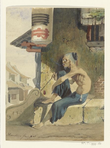 Editor: We are looking at "The Oleander" by Lawrence Alma-Tadema. It’s difficult to know the exact date, but the medium is watercolor and coloured pencil. I'm really struck by how intimate the scene feels, like a glimpse into a private moment. What can you tell me about this piece? Curator: It's a beautiful example of Alma-Tadema's reconstruction of antiquity through a Victorian lens. His paintings weren’t simply about depicting the past; they were about creating an aspirational image, reflecting the cultural values and aesthetic preferences of his own time. Think about the late 19th-century obsession with classical antiquity and the rise of museums. How does this painting speak to that cultural moment? Editor: I see what you mean. It's almost like he's staging a scene from ancient Rome but using Victorian models and ideals of beauty. It's less about historical accuracy and more about creating a sense of luxury and leisure that resonated with the Victorian elite. Curator: Exactly! And look at the oleander itself, carefully placed and painted in every detail. It speaks to the rising popularity of gardens, cultivated leisure, and botanical illustration that also dominated art production at that time. Alma-Tadema was celebrated, and paintings like these affirmed a social order that greatly benefitted from his production of idealized beauty and class distinctions. Do you see those connections here? Editor: That's fascinating. It’s not just a pretty picture, it reflects a lot about the culture that produced it. It definitely changes how I see Alma-Tadema; his focus seems like an attempt to promote and almost justify the status quo of the time. Curator: Precisely! That kind of historicizing makes a huge difference in considering the intentions and reception of paintings such as this. It brings another angle to our appreciation.