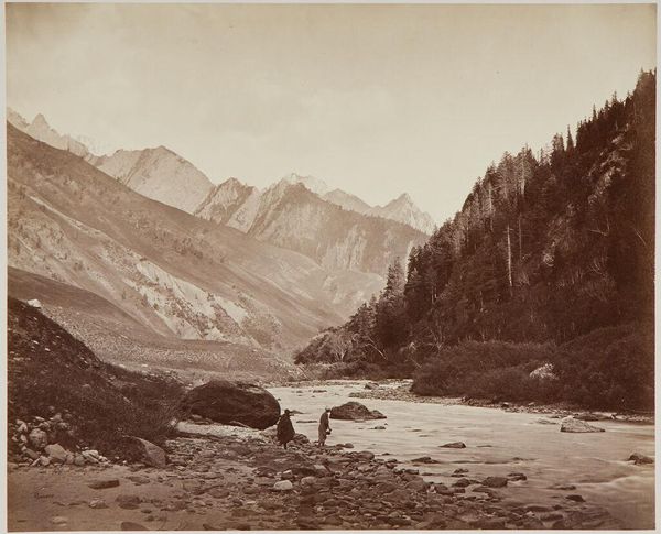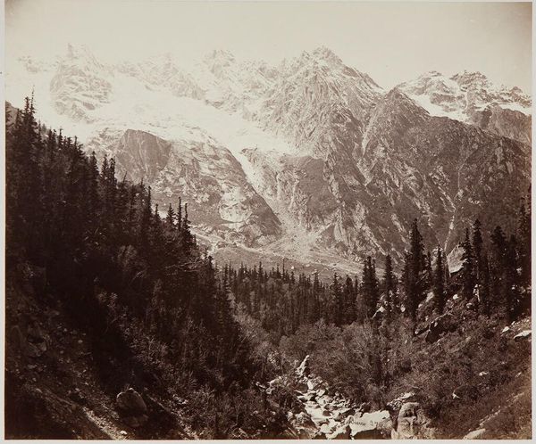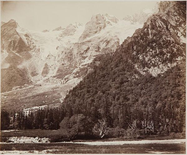 Curator: This is William Henry Jackson's "View on Lake Fork, Looking up Snake Creek, Colorado," an albumen print landscape residing here at the Harvard Art Museums. Editor: It feels like a stage set, doesn't it? The mountains loom like painted backdrops, and the foreground meadow is the bare stage. Curator: Jackson was a pioneer in photographing the American West, his images shaping the nation's understanding of its vast landscapes, especially during a time of westward expansion. Editor: There's a stillness, a silence, that almost feels manufactured—a curated wilderness, if you will. It's beautiful, sure, but also a little…imposing? Curator: Indeed. The lack of human presence is notable. Jackson's vision of the West was often one of pristine, untouched wilderness, which conveniently overlooked the indigenous populations already living there. Editor: Ah, yes. It's easy to get swept away by the vista, forgetting that behind these idyllic scenes lies a more complex narrative. Curator: Precisely. Jackson's images, while breathtaking, also helped fuel a specific agenda of territorial expansion and resource exploitation. Editor: So, a pretty picture with a complicated backstory. Curator: As is so often the case.