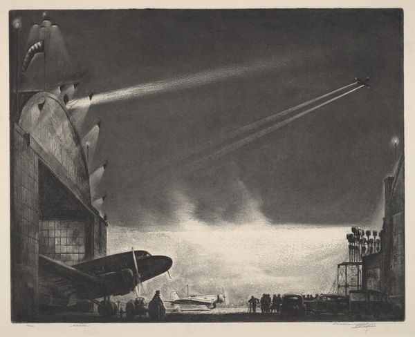 Curator: What a fascinating image we have here: a print entitled “Untitled (Seaplane Over the Ocean)” by Clayton Knight, rendered with pencil and charcoal. The monochromatic palette gives it such an austere yet romantic feeling. Editor: Austere is precisely the word that jumps to mind. I find it almost menacing, with that huge aircraft juxtaposed against the eclipse. It certainly commands attention, but not necessarily of a warm and inviting kind. Curator: It strikes me that this could reflect anxieties prevalent at the time, perhaps linked to the increasing militarization of aviation and geopolitical instability. Think about the period during which it was made; we have war and rising authoritarianism casting a long shadow. Editor: Yes, perhaps this looming seaplane embodies something of a prophecy—the advent of military dominance of the skies. Beyond its cultural context, the seaplane in itself carries a duality: it signifies technological advancement, and perhaps national ambition. Curator: I'm curious about the sun, though. Do you read it more as eclipsed, suggestive of loss of hope, or something being hidden? Editor: Eclipsed absolutely—perhaps hinting at the fading optimism of a certain generation as another world war became inevitable. In terms of symbolism, eclipses often represented times of cataclysmic transformation and, also the limits of our own power to comprehend the universe. Curator: True, and it could be reflective of broader social changes related to modernity and mechanization, leading people to experience an almost existential unease as they grapple with their role in an increasingly impersonal world. Editor: I do concur with that. Despite the initial ominous feeling, observing those visual symbols of the seaplane juxtaposed with an eclipsed sun invites one to pause, reflect and analyze the signs of technological transformation or change. Thank you. Curator: My pleasure! And thinking about it, an approach like this can lead to unexpected reflections about where we're heading, too.