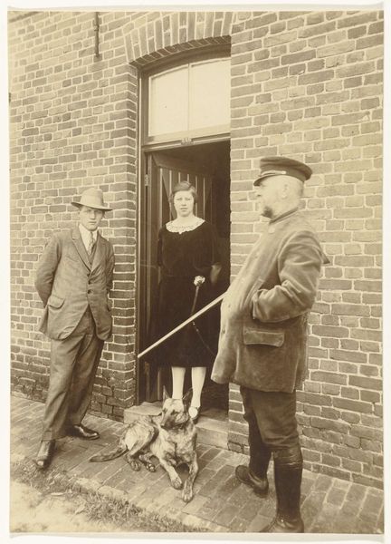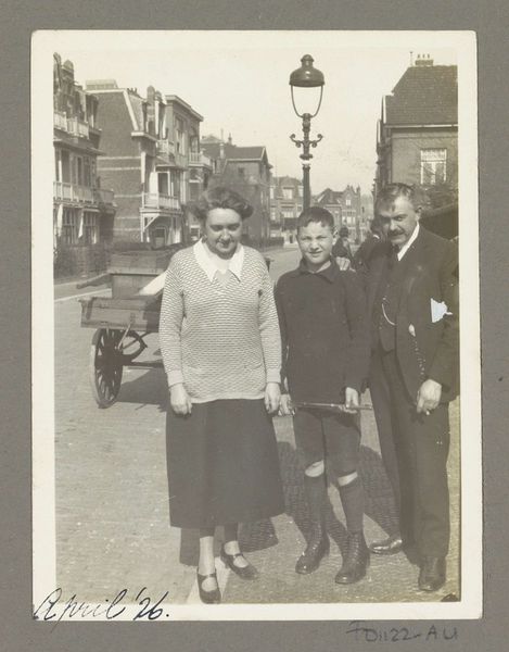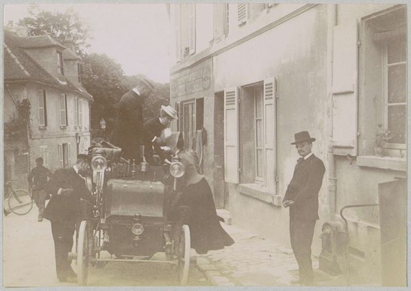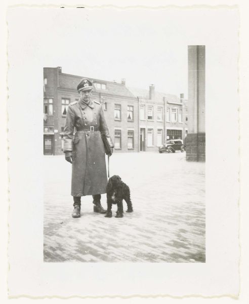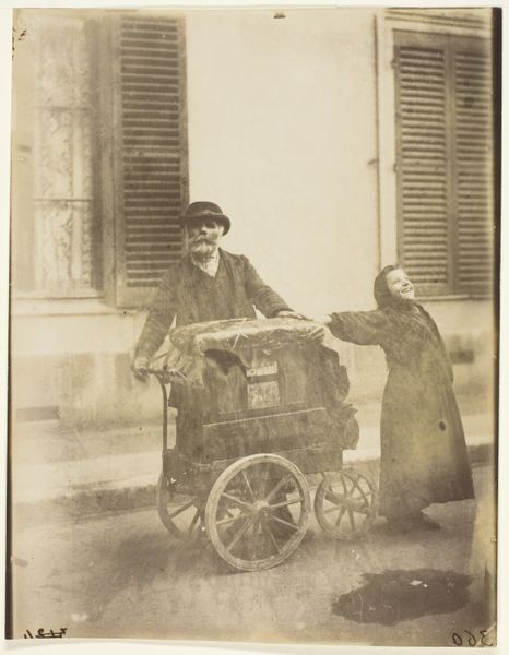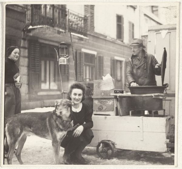 Editor: This photograph, "Street vendors--People," by Robert Frank, dated between 1941 and 1945, captures a street scene with vendors and passersby. I am struck by the ordinary nature of the subject; it feels like a snapshot of everyday life during wartime. What's your interpretation? Curator: This photograph isn't just a snapshot. Consider the cart, its make, and the wear evident in the image; it reveals the vendor's resources and constraints. The materials—metal, wood—speak to available supplies during that period. How does its presence, a humble vending machine, challenge notions of high art? Editor: I see your point! The focus isn’t just on aesthetics; it's on the means of making a living. The material realities of the vendors are central to understanding the photo. Does the labor involved alter our perception? Curator: Precisely. Frank is pointing to the physical labor, the tools and the raw ingredients for sustenance. Think about how access to these materials defines social standing during a period of war and rationing. Even the dog alludes to materiality. Does the inclusion of the dog further speak about class or labor? Editor: The dog could be there as a companion, or perhaps it’s performing a service, like guarding the cart. Considering Frank’s use of seemingly mundane materials like everyday carts, you suggest his artwork pushes the viewer to value it for cultural rather than aesthetic properties? Curator: Exactly! By highlighting these everyday objects, he makes us think about labor, production, and survival, all integral to human existence, all presented through materials. Editor: This has really opened my eyes to considering the socio-economic context embedded within the artwork itself. Curator: Indeed. It reminds us that even a simple photograph can be a powerful statement about material conditions.