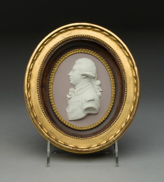This is a plaque with a portrait of Mrs. William Eden, Lady Auckland, made by the Wedgwood Manufactory. The Wedgwood company was established in 18th century England, and quickly became associated with high-end ceramic production. The firm's specialization in jasperware, like the blue and white seen here, imitated the look of ancient cameos, appealing to consumers eager to identify with classical ideals. The neoclassical style was popular among the elite, and the company developed a reputation for catering to aristocratic tastes. Lady Auckland's portrait, set in a gold frame, reflects the fashion of the time, especially among affluent women. Though portraits had long been the domain of painters, the Wedgwood firm cleverly adapted this tradition to the medium of molded ceramics. To better understand this work, consider researching the market for luxury goods in 18th century Britain, and the history of the Wedgwood company itself. By doing so, we can see how this portrait reflects specific social structures and economic conditions.