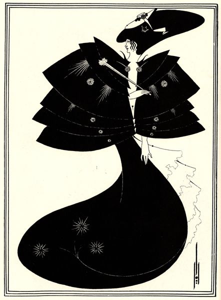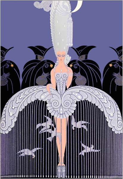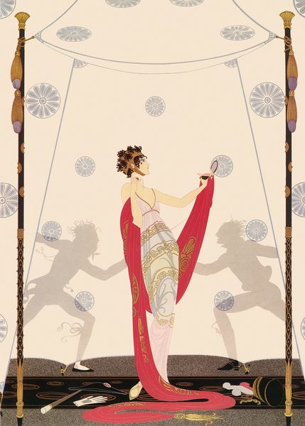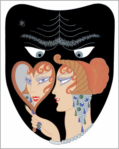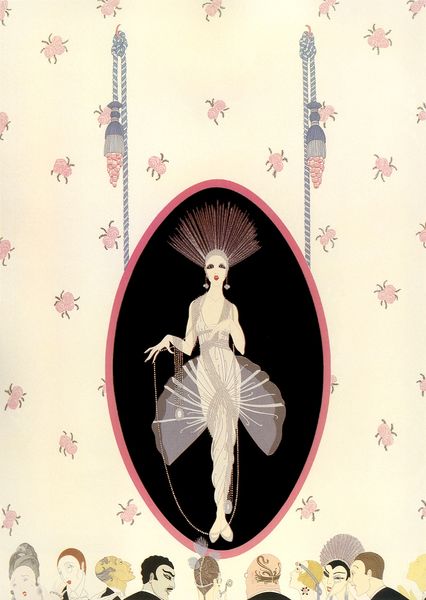 Editor: Here we have Erte's *Fantasia*, it is not dated but presents the artist's unique symbolism with art deco lines and a central figure, almost ethereal in its presentation. The colours are dreamy and light, a stark contrast to the sharp edges of art deco in other artists, but it's the figure that commands attention. What draws you to it? Curator: Ah, *Fantasia*. It feels like stepping into a whispered secret, doesn't it? The almost dreamlike softness you pointed out is key; Erte was, in a way, a conjurer of emotions, and he uses those gentle pastel hues to evoke a feeling of delicate longing. Do you feel it too? A kind of yearning for a beauty that’s just beyond reach, a world forever shrouded in twilight mystery? Editor: Definitely. It is like I'm looking at the image of a poem. So the butterflies are a symbol of transformation perhaps, but why the almost sinister black backdrop? Curator: You’ve caught the delicious paradox at the heart of this! Precisely – butterflies often speak of metamorphosis, yes! And the dark background is where things become fascinating. Think about how theater uses lighting – the black could be like the stage curtains drawing attention to the luminous figure, or, it might echo the anxieties bubbling beneath the surface of the 'Roaring Twenties,' a subtle premonition perhaps. Which of those elements do you feel tugs you closer? Editor: I like that the black provides depth rather than gloom; I might actually pick the luminous stage curtains concept. What a lovely piece. I will never see Erte in quite the same way. Thanks. Curator: You know, sometimes art whispers its secrets best when we find our own reflections within it. Thanks to you for letting it breathe.