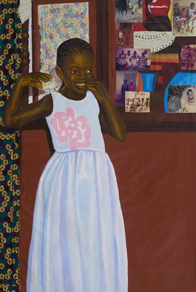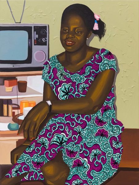 Njideka Akunyili Crosby made "Wedding Souvenirs" with paint and collage. The surface is a layered experience, and I can see the build-up of textures and colours, where the artist is exploring the idea of artmaking as a process. I love how the composition is constructed: a painting within a painting, or maybe a memory encased in a frame. The woman in the painting has this quiet intensity, a stillness that draws you in. Then you notice the patterned background, a riot of colours and shapes that seem to vibrate with life. The patterns are like a visual echo of the souvenirs mentioned in the title. Look at the way the patterned fabric clashes and complements the subject of the portrait. The background doesn't sit still; it feels like it moves. Akunyili Crosby seems to be in conversation with artists like Chris Ofili, in her use of pattern and layering. She is creating a space for ambiguity and multiple readings.